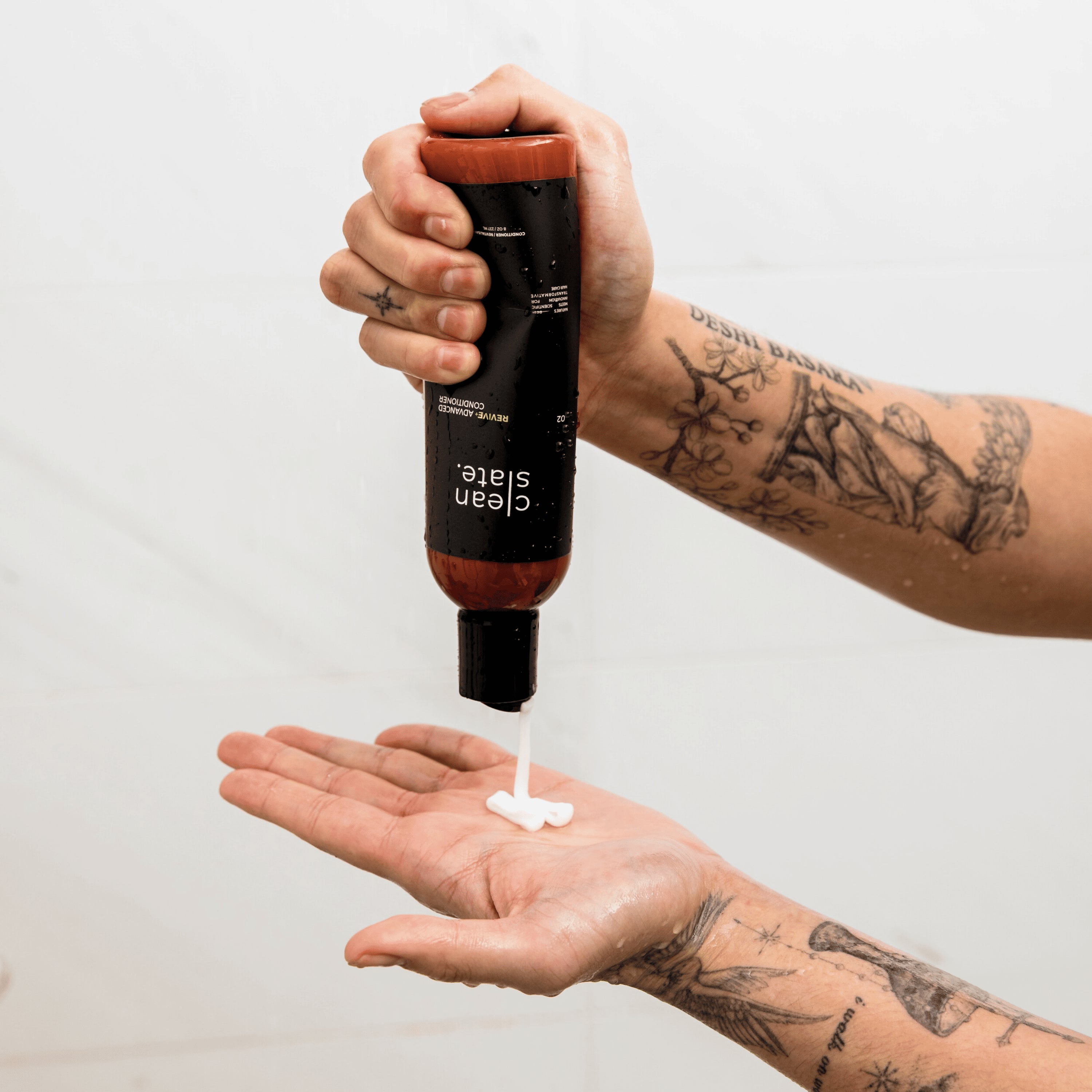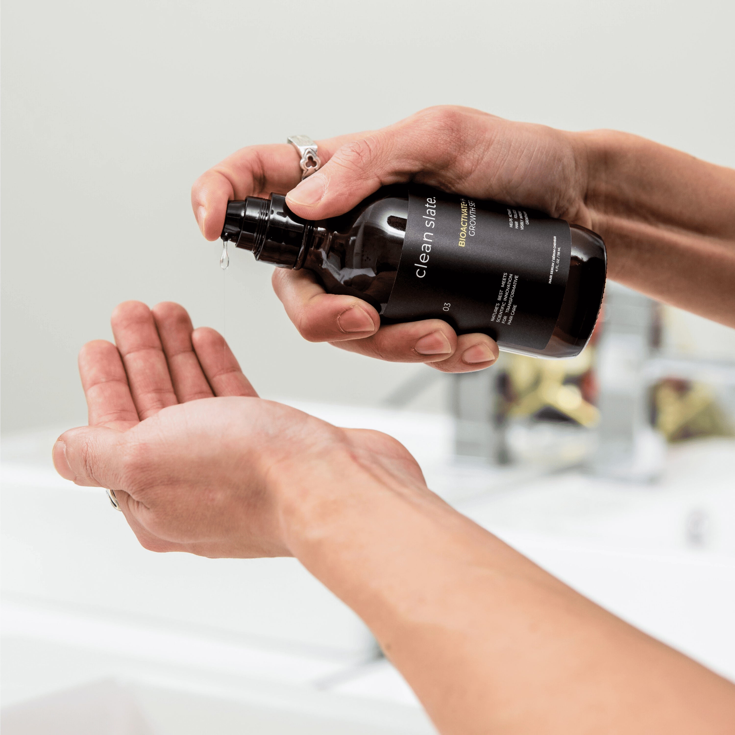 Massage into wet hair and scalp. Awake+ clears the buildup that disrupts scalp and follicle balance — restoring texture, volume, and manageability. Rinse thoroughly.